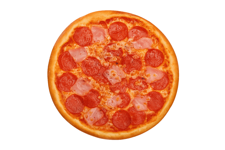 Состав: тесто, соус томатный, масло чесночное, сыр моцарелла, ветчина, поми...