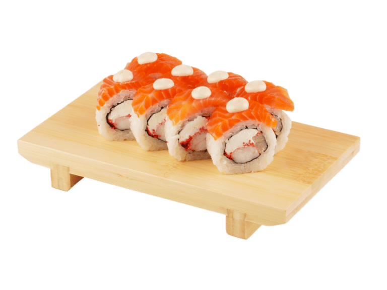 Состав: рис, нори, креветка, лосось, сыр сливочный, омлет, икра масаго, япо...