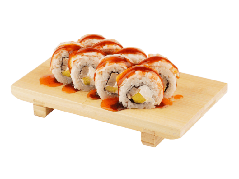 Состав: рис, нори, сыр сливочный, манго, креветка, гребешок морской, соус у...