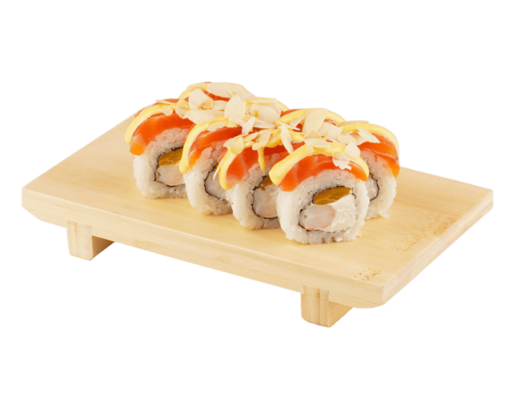 Состав: рис, нори, креветка, лосось, сыр сливочный, апельсин, миндаль, соус...