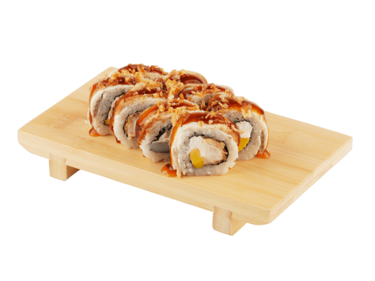 Состав: рис, нори, сыр сливочный, креветка, угорь, манго, лук жареный, соус...