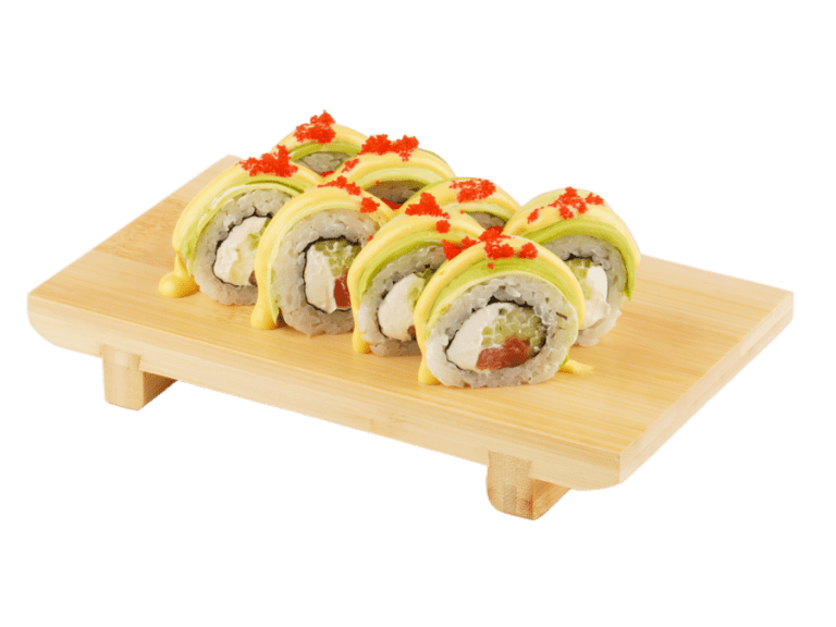 Состав: рис, нори, сыр сливочный, лосось, авокадо, соус манго, икра масаго,...