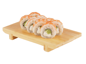 Состав: рис, нори, сыр сливочный, лосось, авокадо, соус манго, икра масаго, огурец