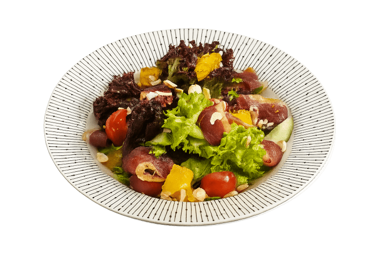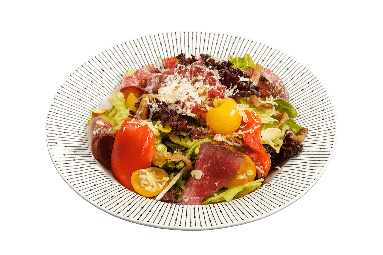 Состав: микс салата, подкопченный ростбиф, перец болгарский, помидор черри,...