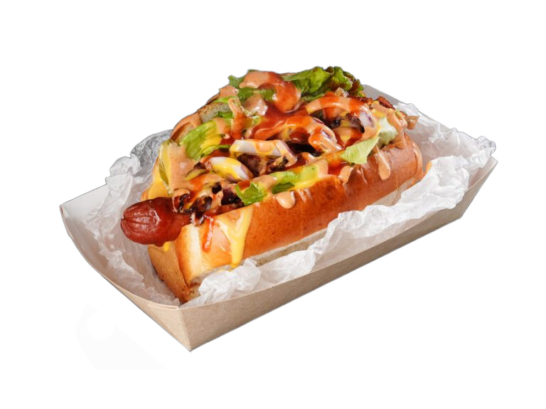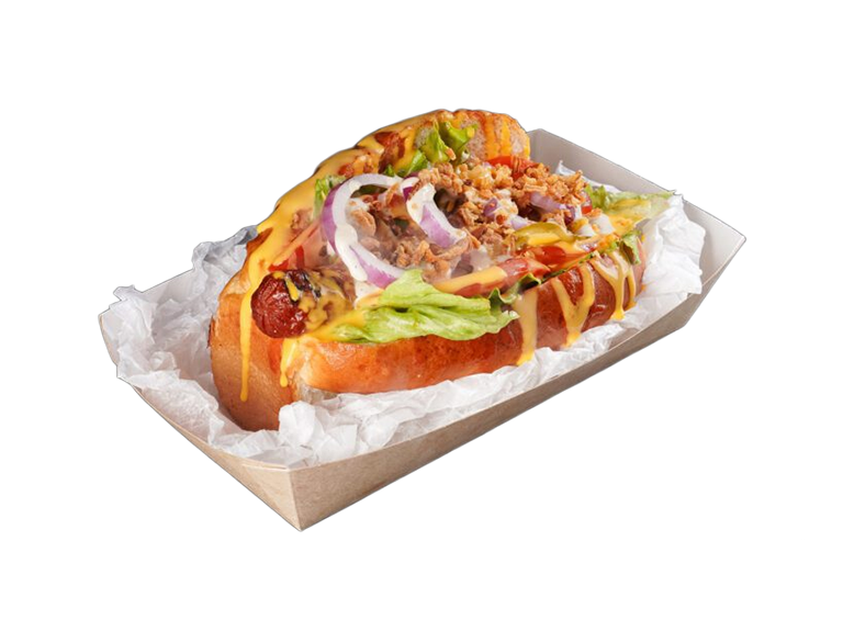 Состав: булочка, сосиска говяжья, лук жареный, бекон, огурец соленый, салат айсберг, капуста, Пармезан, соус сырный, соус "Цезарь",