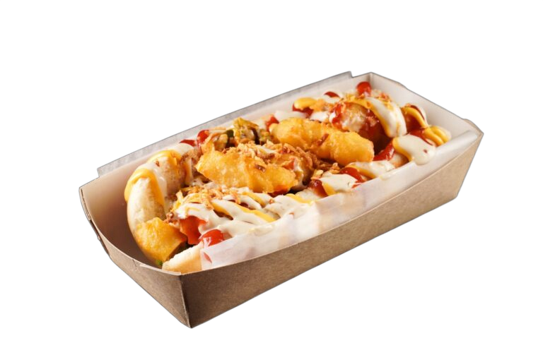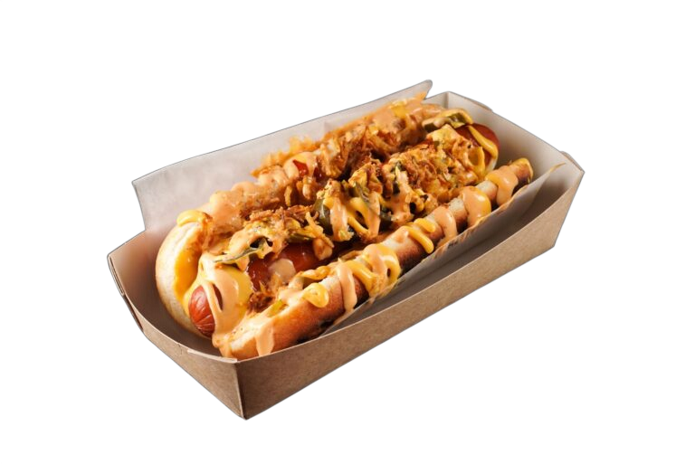 Состав: булочка, сосиска куриная, лук жареный, салат айсберг, огурец соленый, халапеньо, соус сырный, кетчуп, соус BBQ